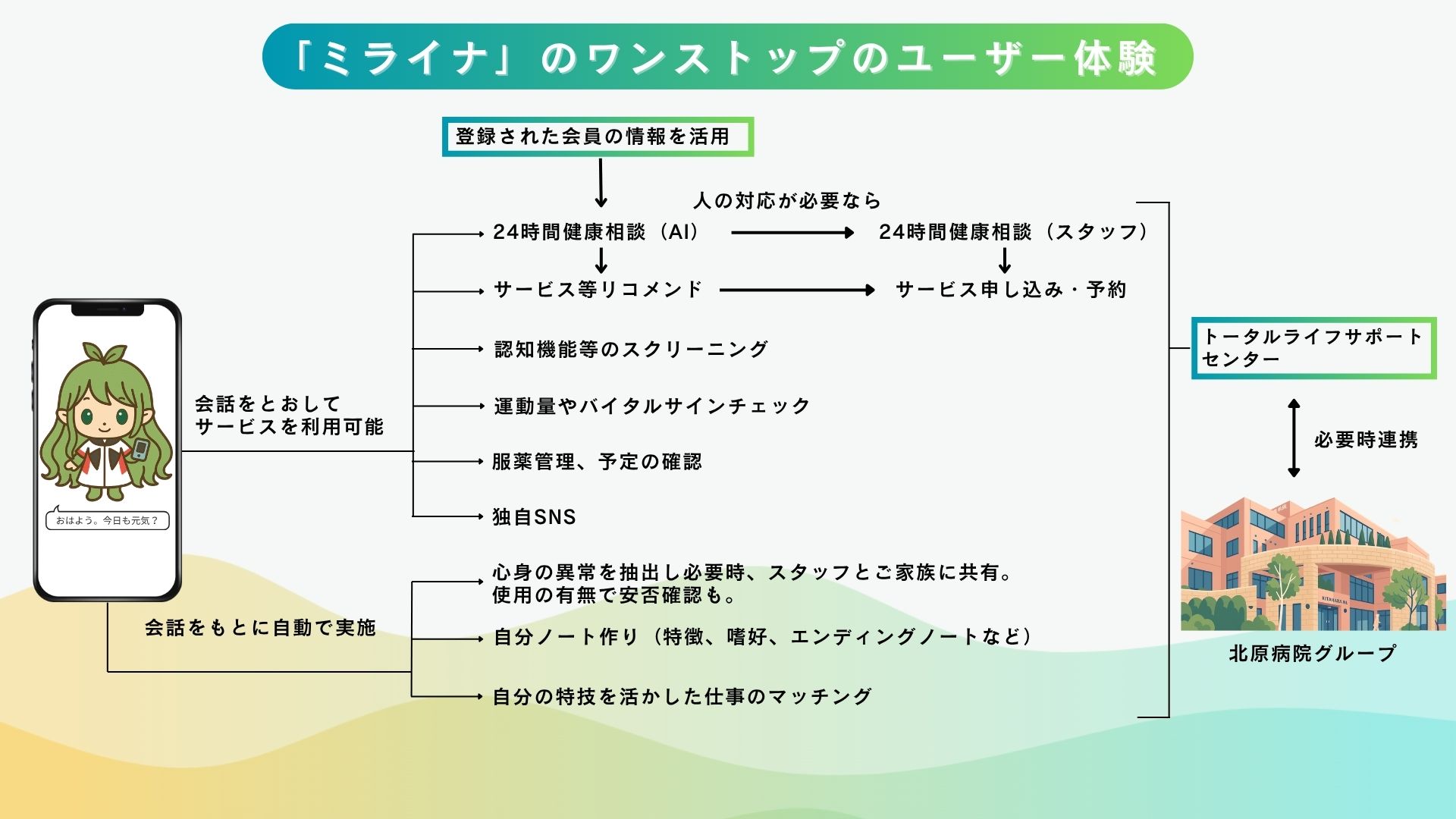 北原グループ(医療法人社団KNI、株式会社Kitahara Medical Strategies International(以下、KMSI/所在:東京都八王子市)は、kanata株式会社(以下、kanata)と連携し、AIアバターを窓口に“暮らし・健康・相談”をワンストップで提供するトータルライフサポートアプリ「ミライナ(仮称)」を共同開発しました。年度内の正式リリースを目指し、まずは八王子周辺から段階的に提供を開始します。