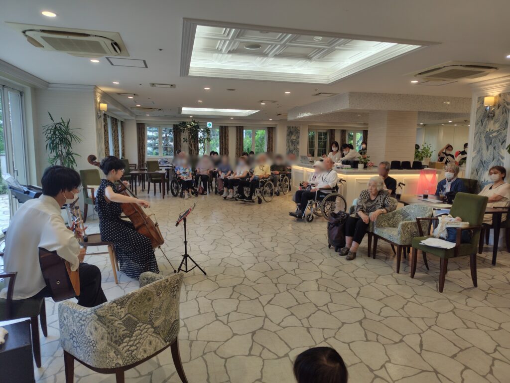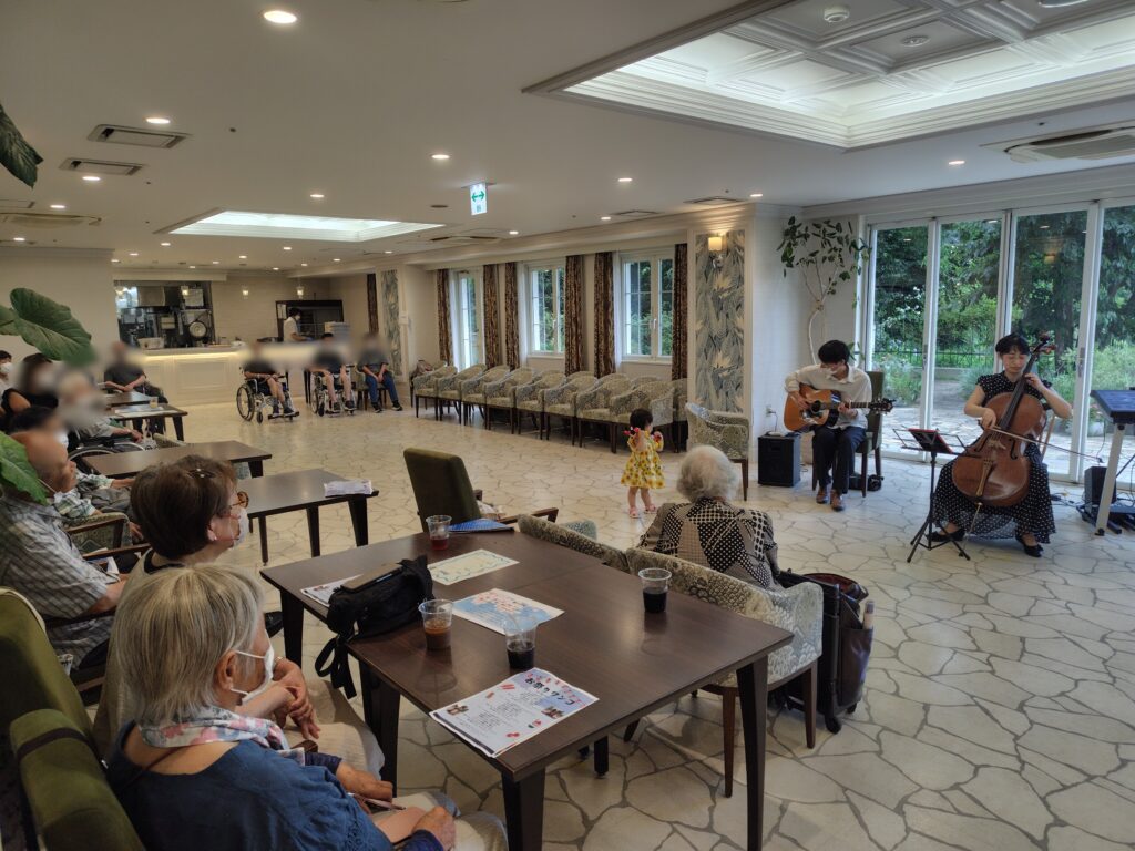 会場には入院中の患者様や病院スタッフ、そして北原トータルライフサポート倶楽部の会員が集まり、それぞれの特技を披露。サックスの力強い音色、チェロの深みある響き、ギターの軽快なリズム、さらにエレクトーンの弾き語りまで、幅広いジャンルの音楽が響きわたり、病院全体があたたかな笑顔に包まれました。